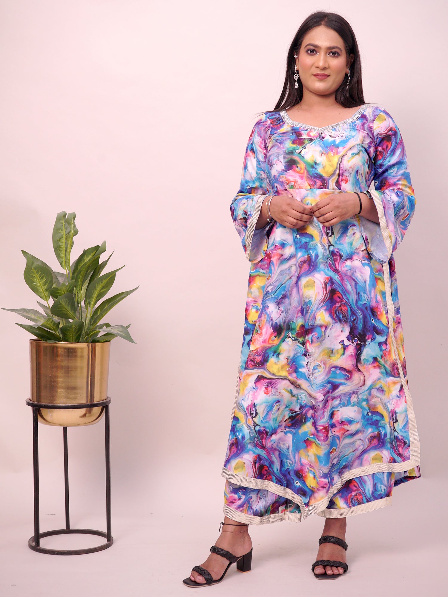 Unleash your vibrant side with this stunning multicolour abstract print kaftan dress, a perfect fusion of artistic flair and relaxed elegance. Crafted from a lightweight, flowy fabric, this dress features a mesmerizing swirl of bold hues—from electric blues to sunset pinks—making it a true statement piece. The relaxed fit, V-neckline, and long sleeves provide comfort and ease, while the metallic silver sequin trim along the neckline, sleeves, and asymmetrical hem adds just the right amount of festive sparkle. Perfect for resort wear, festive brunches, or casual celebrations.