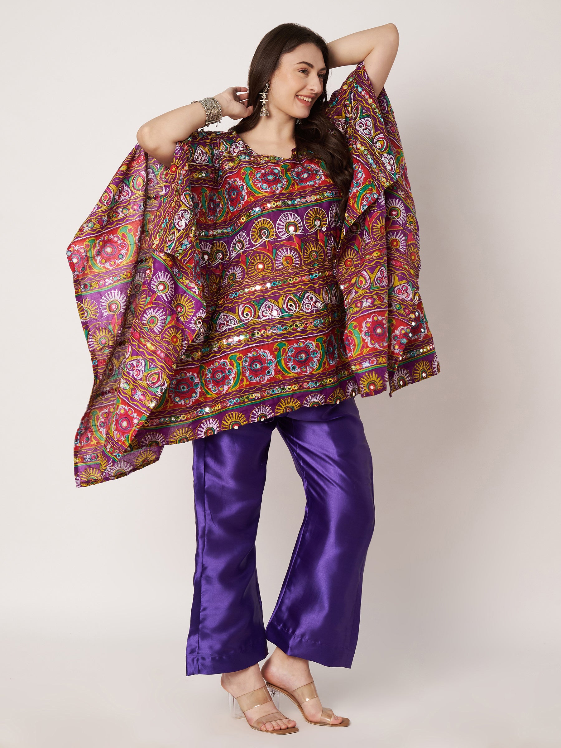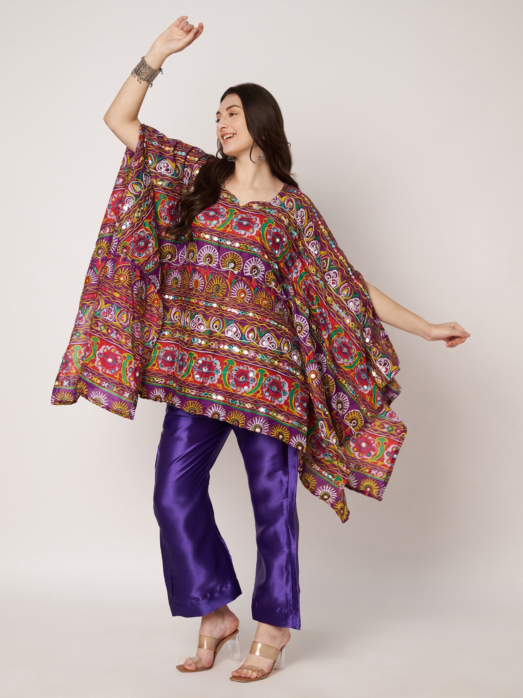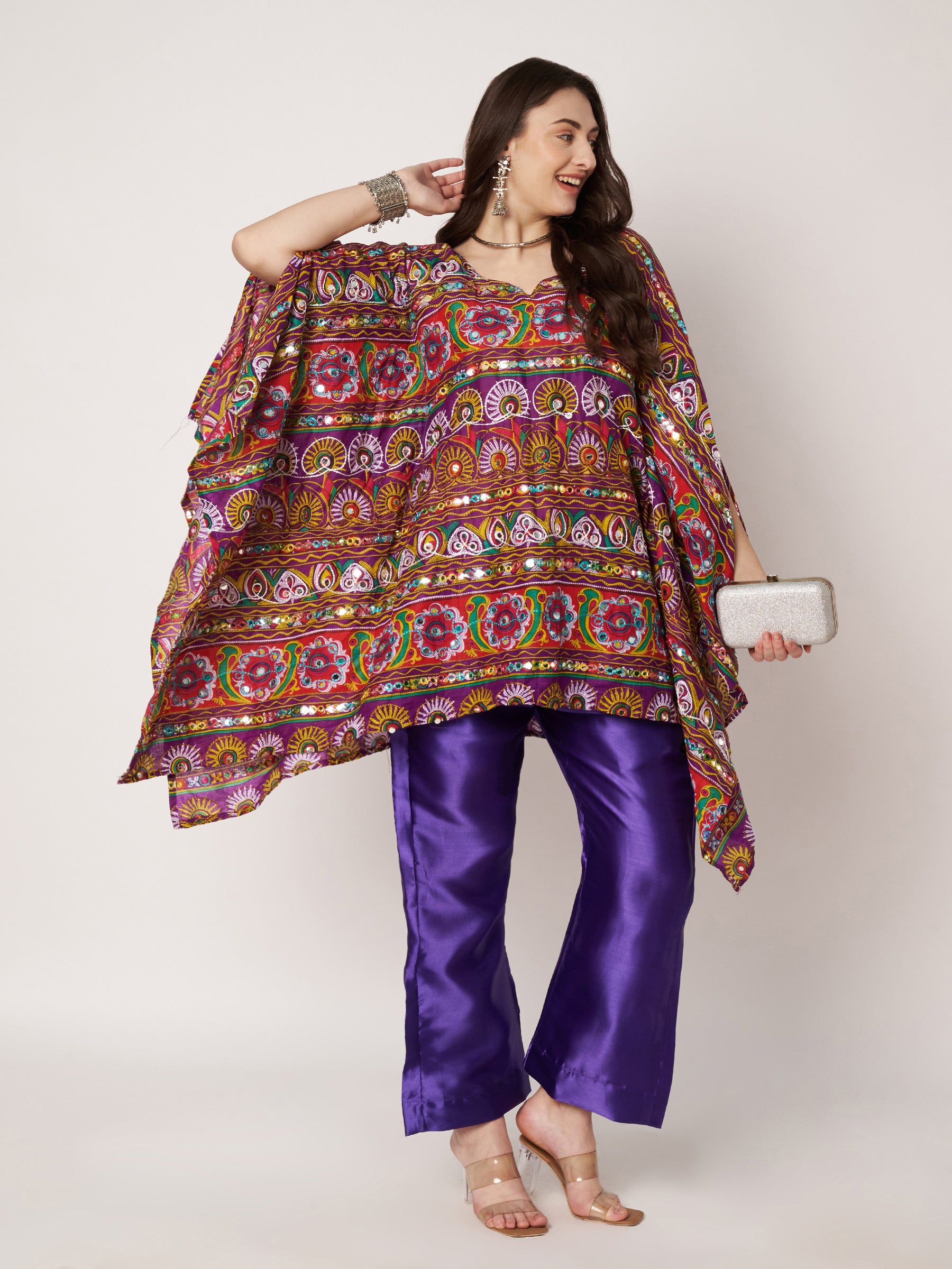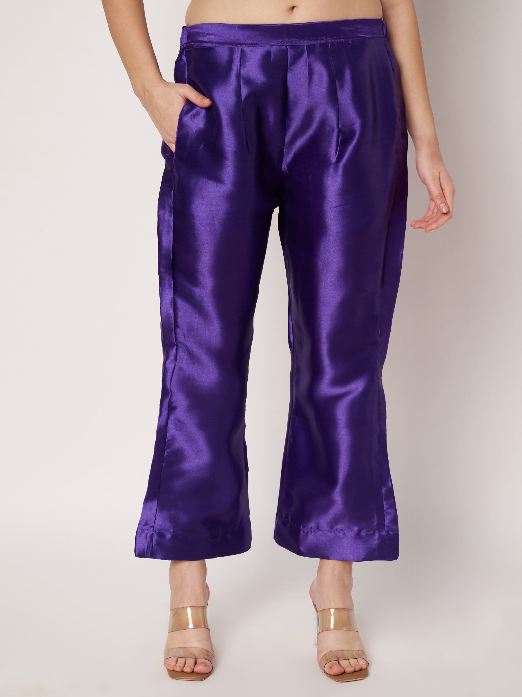 It features a gorgeous array of vibrant colours and patterns that will add a touch of handcrafted beauty to your wardrobe. The vibrant purple palazzo pants will elevate your style and leave a lasting impression.