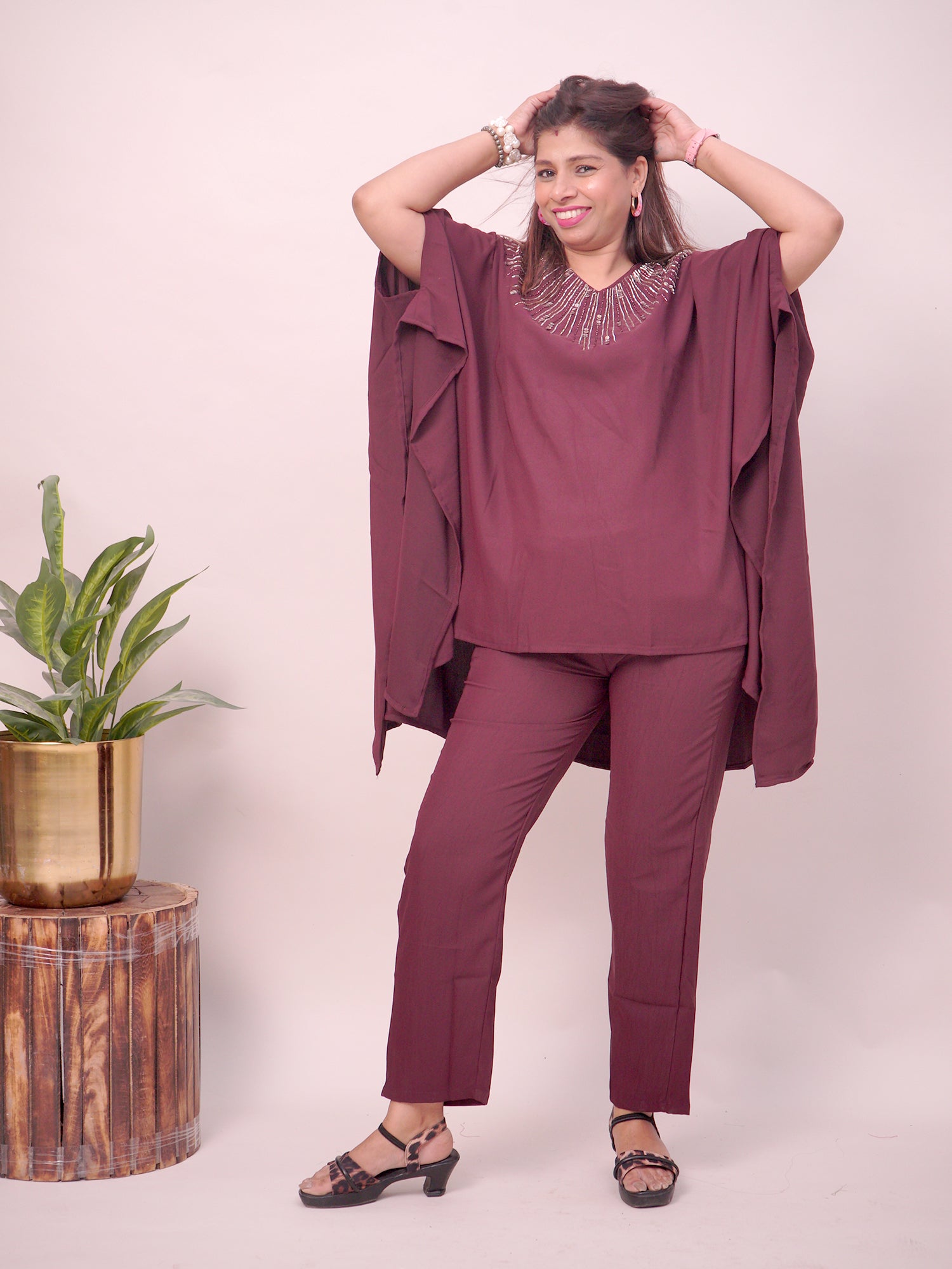 Discover a chic and modern look with our Kaftan Style cord set. The Chinese collar and sequence work give a sophisticated touch to any outfit. Suitable for all occasions and ages, this dress is a must-have for any fashion-forward woman.