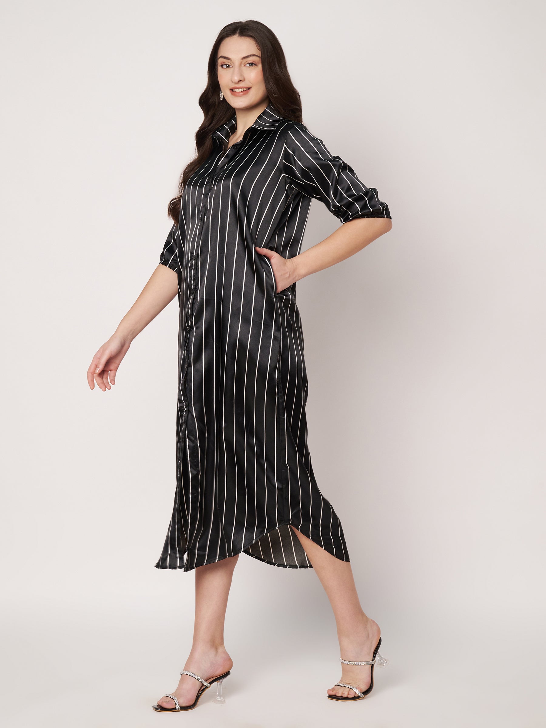 Elevate your everyday wardrobe with this sophisticated black striped long shirt dress. Designed with a contemporary silhouette, this versatile piece seamlessly transitions from casual daywear to polished evening looks. The classic striped pattern adds visual interest while maintaining timeless appeal, while the extended length provides elegant coverage and comfort. Perfect for layering or wearing solo, this dress combines modern styling with practical wear ability. An essential addition for those seeking refined, effortless sophistication.