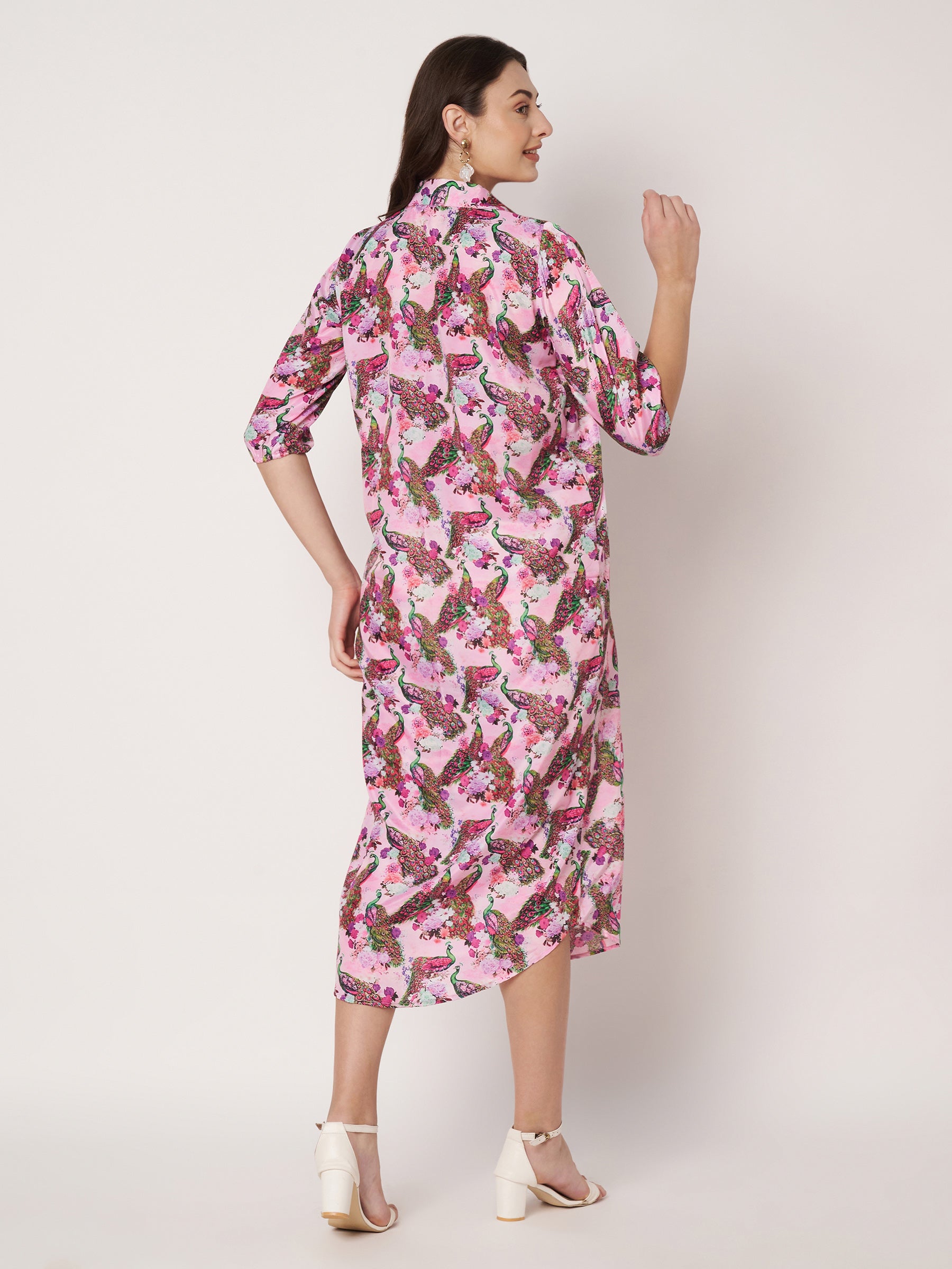 Elevate your everyday wardrobe with this sophisticated shirt-style long dress, featuring an enchanting pinky peacock print that brings timeless elegance to modern silhouettes. Designed with practical functionality, this piece includes convenient pockets for everyday essentials and an adjustable belt that cinches at the waist to create a flattering, customizable fit. The shirt collar and button-front styling offer versatile layering options, making it equally suitable for casual outings or semi-formal occasions. Crafted with attention to detail, this dress seamlessly transitions from day to evening wear, providing a refined option for those seeking both comfort and style in their daily rotation.