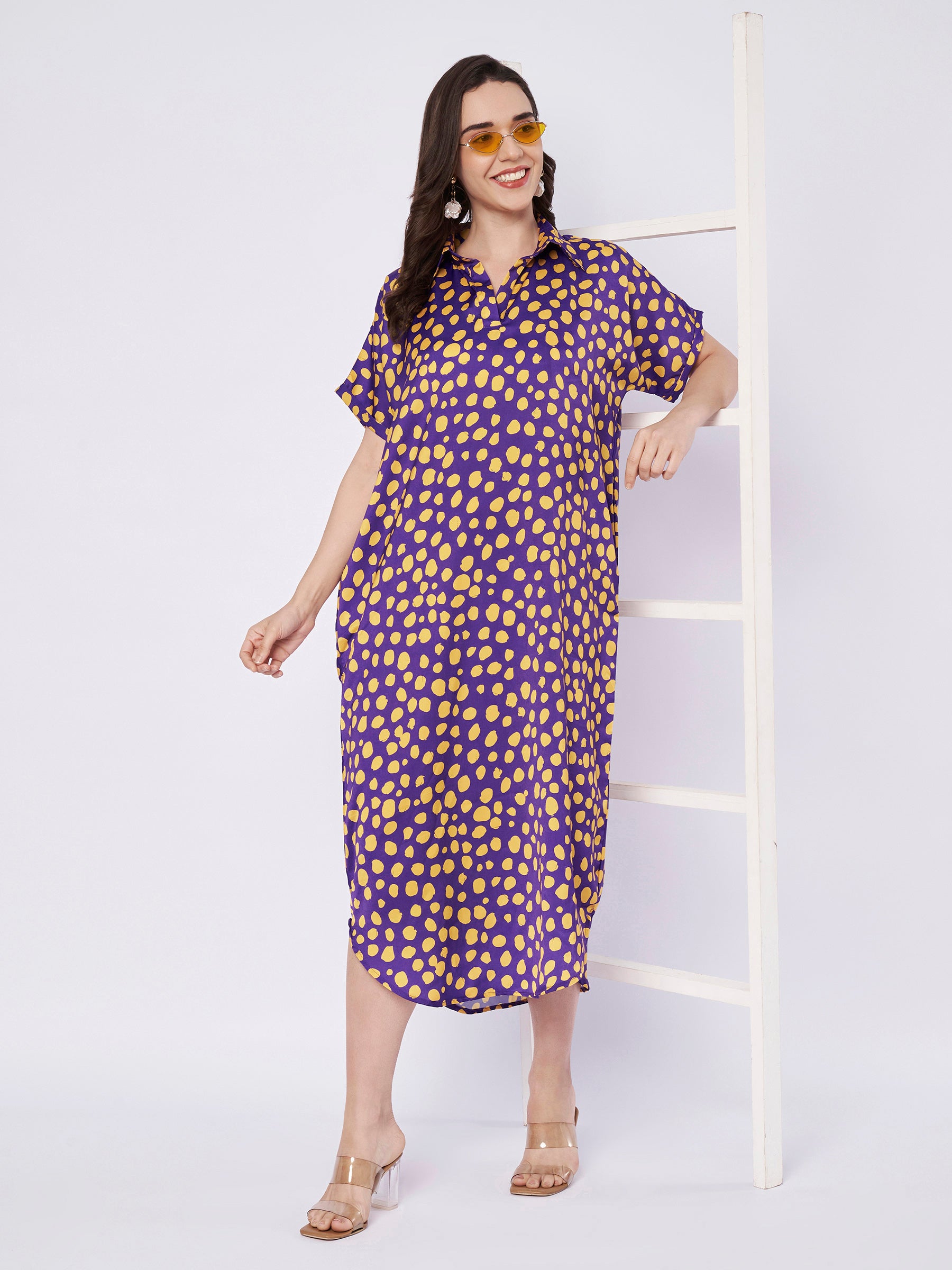 Keep it stylish and comfortable with the Polka Dot Shirt Midi Dress from Kuberakshi. Designed in a rich purple base accented with playful yellow polka dots, this dress brings a fresh and contemporary vibe to your wardrobe.